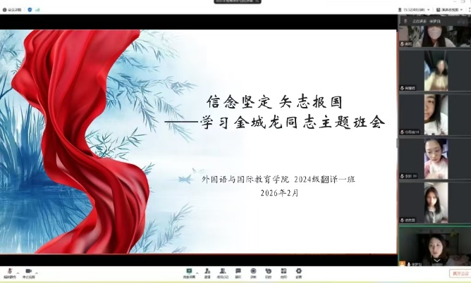 彩票计划网 4个年级31个班级分别组织了“学习金城龙同志先进事迹”线上主题班会,通过事迹介绍和心得分享的方式,深入学习了金城龙同志矢志报国、舍己为人、甘于奉献、向上向善的崇高精神和感人事迹。彩票计划网 团委书记李宇晨主持召开了“信念坚定 矢志报国——全网最准彩票计划网官方 学生会学习金城龙同志主题交流会”,带领彩票计划网 学生会全体成员进行了深入学习和集中交流。通过学习,大家表示一定要以金城龙同志为榜样,彰显新时代青年应有的责任与担当。